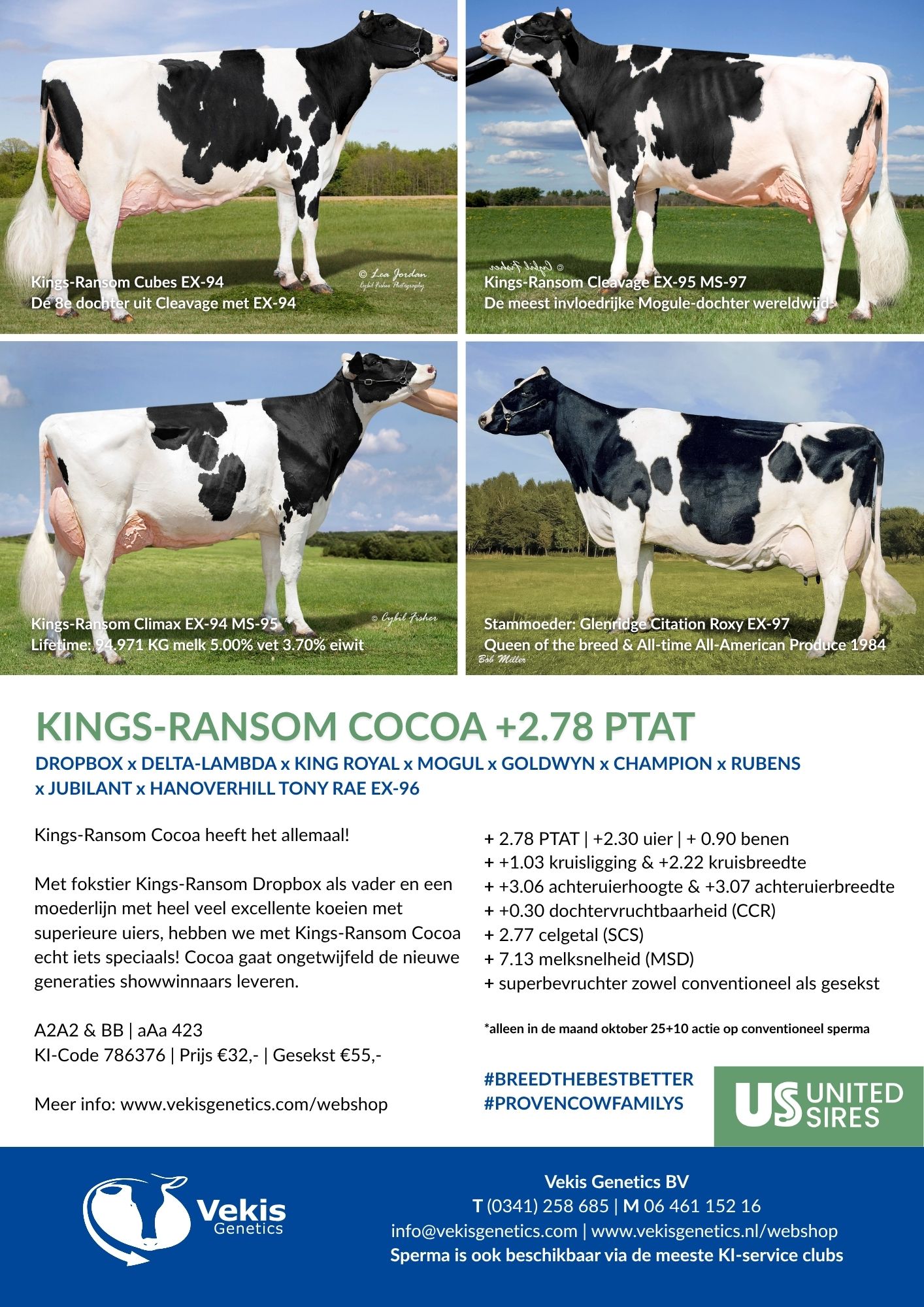 De stammoeder en koe op de foto in de flyer is Clear-Echo Ramos 1200 EX-94. Zij is de moeder van De-Su Bookem en SSI Mogul Reflector! In 2013 heeft Vekis Genetics deze koe in levende lijve gezien en maakt een zeer goede indruk. "Een bak van een koe!" Toen Cashback beschikbaar kwam bij United Sires hoefde zij er niet lang over na te denken om hem te gaan verkopen!